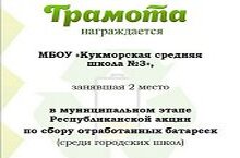 В муниципальном этапе Республиканской акции по сбору отработанных батареек наша школа заняла 2 место.Выражаем благодарность родителям и ребятам, которые откликнулись на экологическую акцию и приняли активное участие!
