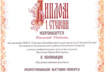 «Вятские мастера" декоратив-гамәли иҗат буенча балалар һәм педагогларның төбәкара күргәзмә-конкурсы кысаларында 9 нчы сыйныф укучысы Васильев Никита Валентин улы "Агачка язу" номинациясендә 1 нче урынны алды.