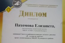 Воспитанница дошкольной группы Пахомова Елизавета приняла участие и стала победителем районного конкурса детского рисунка "Я - за мир на дорогах!". Поздравляем!