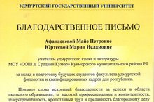 Учителя удмуртского языка и литературы Афанасьева Майя Петровна и Юркеева Мария Ислановна получили от ректора ФГБОУ ВПО "Удмуртский государственный университет" Мерзлякова Г.В. благодарственное письмо Поздравляем!!!