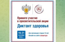 В России с 16 по 21 сентября пройдет федеральная образовательная акция «Диктант здоровья». Цель мероприятия – популяризация санитарно-гигиенической грамотности и норм здорового образа жизни. Участники «Диктанта здоровья» проверят свои знания по основным правилам личной гигиены,здоровому питанию и профилактике заболеваний. В акции смогут принять участие все желающие старше 13 лет.
