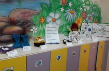 На выставке представлены работы воспитанников младшей группы. Работы выполнены в смешанной технике (аппликация и роспись гуашевыми красками).
