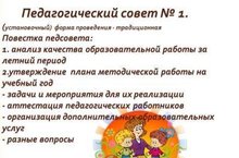 В ДОУ состоялся «Установочно-организационный» педсоветна тему: «Основные задачи и направления работы детского сада на 2017– 2018 учебный год».Кроме организационных вопросов была утверждена модель воспитательно – образовательного процесса в ДОУ с учетом ФГОС ДО и примерной образовательной программой "Мир открытий".