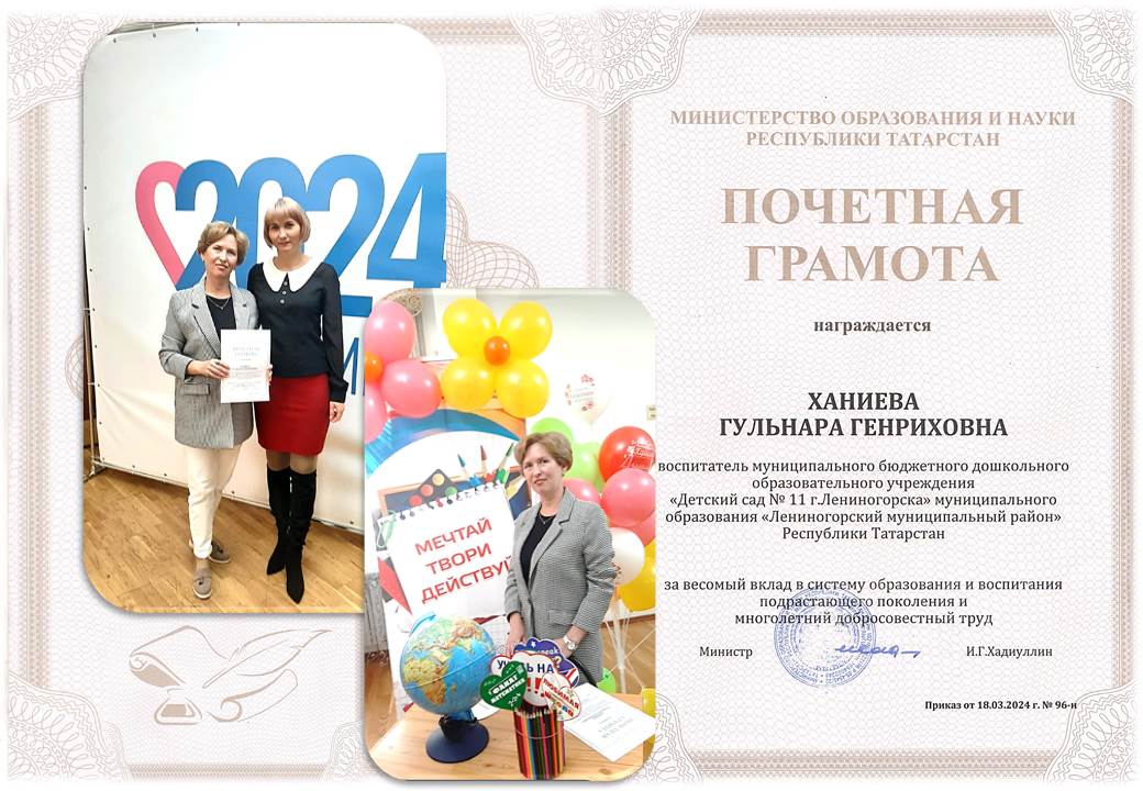 ПОЗДРАВЛЯЕМ нашего воспитателя ХАНИЕВУ ГУЛЬНАРУ ГЕНРИХОВНУ с вручением ПОЧЕТНОЙ ГРАМОТЫ МИНИСТЕРСТВО ОБРАЗОВАНИЯ И НАУКИ РТ за весомый вклад в систему образования и воспитания подрастающего поколения и многолетний добросовестный труд.