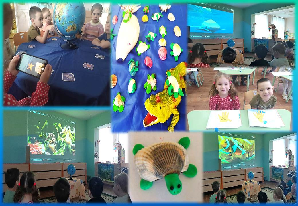 В старшей группе в рамках кружка "Клуб юных путешественников" была изучена тема «Морские обитатели». Подводный мир напрямую не доступен для изучения детьми. А там столько всего интересного: животные, рыбы, растения, водоросли, ракушки. Всё это интересует ребят. Но как же попасть туда? Современные средства и методы обучения технологии дополненной реальности позволяют это сделать, что делает их активными участниками образовательного процесса. С ребятами были проведены беседы «Знаешь ли ты морских обитателей?», «Кто такие осьминоги?», «Почему так назвали морского конька?», «Кто живет в воде: животные или рыбы?». Дети посмотрели мультимедийный фильм «Морские обитатели», играли в игру "Море волнуется", изображали подводных обитателей, сделали аппликацию "Осьминожек". А завершением темы стало раскрашивание морских ракушки и изготовление морских черепашек.
