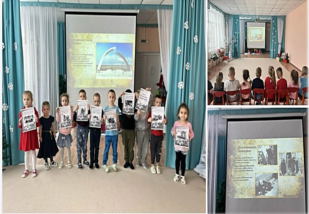 В старшей группе прошёл важный урок памяти посвяшённый Дню полного освобождения Ленинграда от фашистской блокады. С помощью мультимедийной презентации ребята перенеслись в героическое прошлое нашей страны. Особый трепет у детей вызвал рассказ о «блокадном хлебе» и стойкости ленинградских детей. Ребята рассмотрели фотографии памятника "Разорванное кольцо', который стоит на берегу Ладоги»
