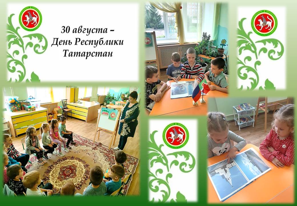 30 августа-День Республики Татарстан. В преддверии Дня Республики Татарстан, который отмечается 30 августа, а также с целью формирования у воспитанников целостного представления о родном крае, воспитания познавательного интереса, любви к своей малой Родине в детском саду прошло мероприятие « Моя республика – Татарстан». Началось мероприятие с знакомства детей с флагом, гербом Татарстана.