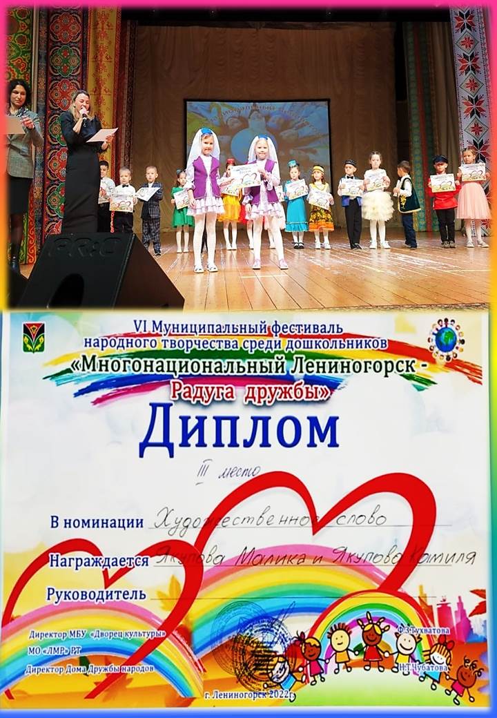 Поздравляем Якуповых Малику и Камилю, занявших III место в муниципальном фестивале народного творчества среди дошкольников "Многонациональный Лениногорск. РАДУГА ДРУЖБЫ"