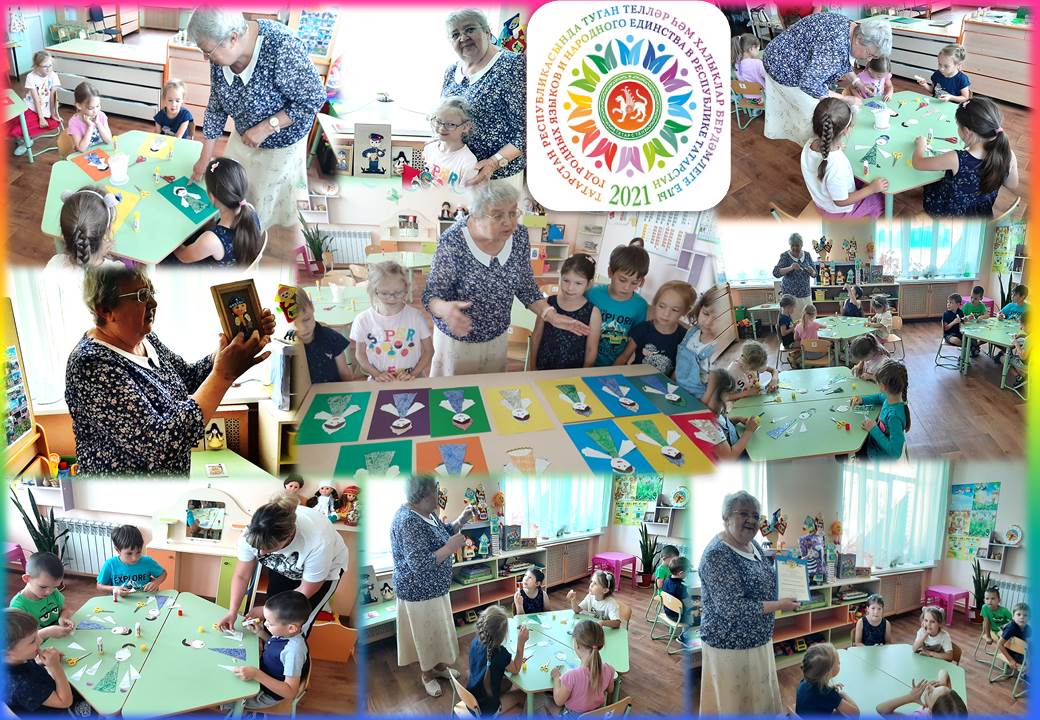 Татарстан Республикасы территориясендә яшәүче халыкларның милли мәдәниятен, халык һөнәрләрен, декоратив-гамәли иҗатын үстерү, саклау максатыннан, балалар бакчасында «Халык иҗаты сукмаклары буйлап» дип исемләнгән күргәзмә оештырылды, анда педагоглар, тәрбияләнүчеләр һәм аларның әти-әниләре катнашты. Күргәзмә балаларны халык иҗаты чыганакларына җәлеп итә торган эчтәлекле һәм үзенчәлекле булды. Барлык яшь төркем балалары, уңай эстетик хисләр, нәфис образдан кичерешләр алып, күргәзмәдә булдылар.