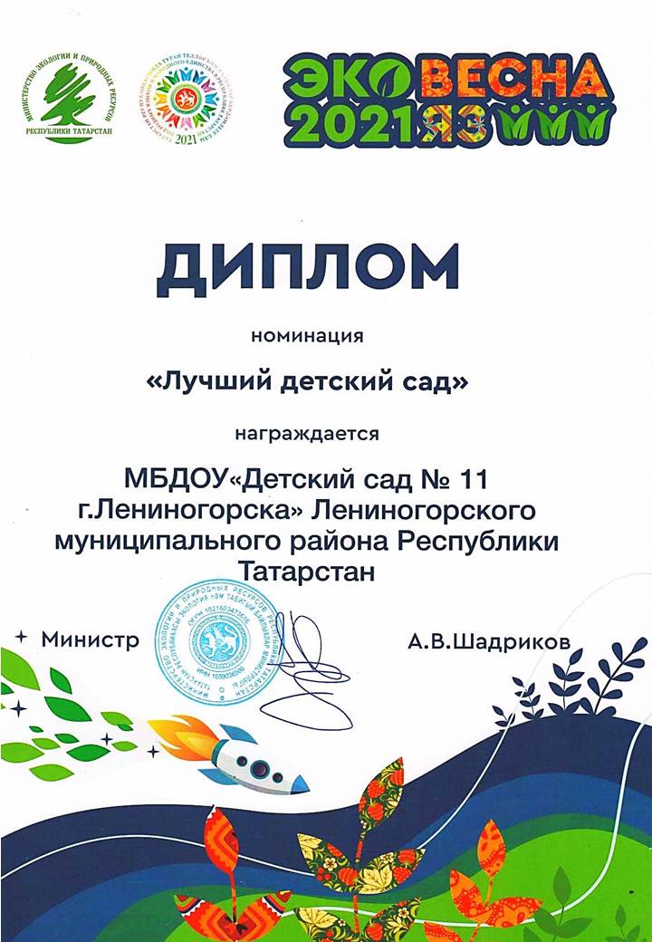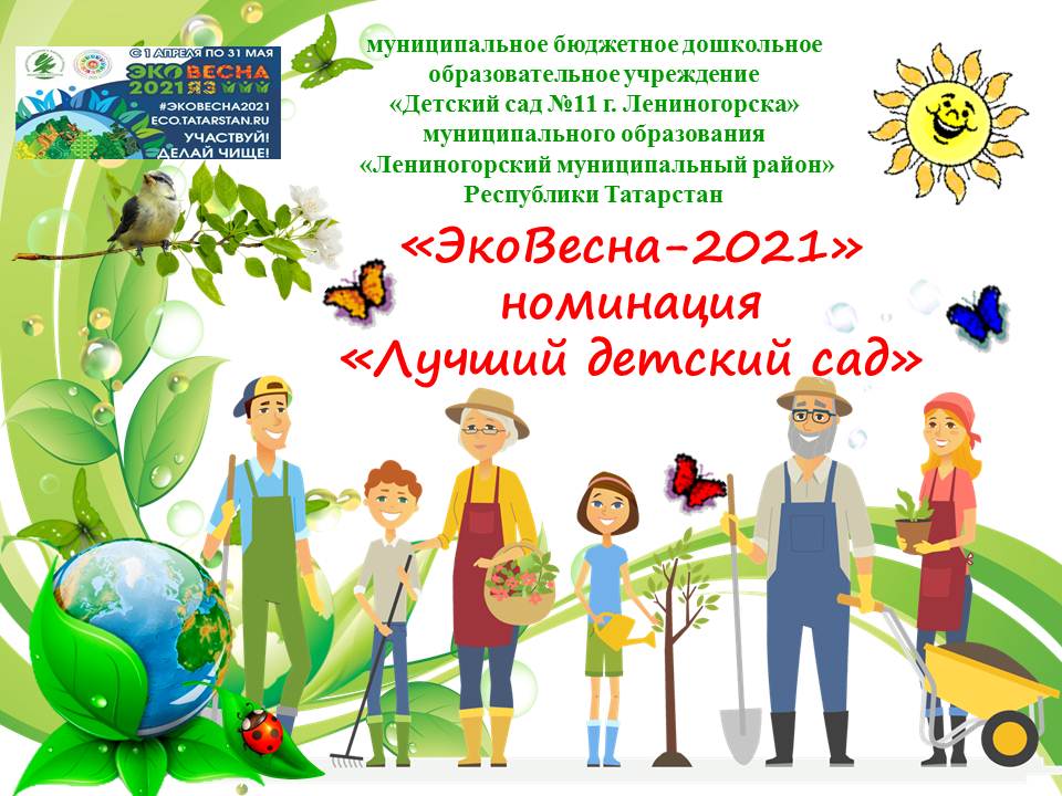 На основании приказа Министерства экологии и природных ресурсов РТ No 3492/13 от 30.03.2021г. «О проведении Республиканской акции «Эковесна – 2021», приказа управления образованияNo513 от 21.04.2021г. «О проведении муниципального этапа Республиканской акции «Эковесна –2021»»,в целях пропаганды экологического значения особо охраняемых природных территорий, воспитания у молодого поколения бережного отношения к природному наследию Республики Татарстан с 20 апреля по 11 мая 2021 года в образовательных учреждениях был проведен муниципальный этап Республиканской акции «Эковесна -2021». В рамках Республиканской акции был представлен проект. Мы стали победителями муниципального этапа Республиканской акции «Эковесна -2021» в номинации «Лучший детский сад».