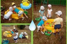 Лето подарило нам много солнца. Поэтому особое удовольствие малышам доставляют игры с водой: вот девочки помыли «овощи» для салата, вот юный рыболов проверяет удочку. А вот мини - бассейн с плавающими мячиками просто манит детишек поиграть и ладошками поплескать водичку. Вода дарит и отдых, и игры, и настроение.