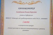 Поздравляем Газетдинову Полину Борисовну, учителя-дефектологу МБДОУ №12 с победой (1 место) в муниципальном конкурсе "Лучший конспект по социально-коммуникативному и речевому развитию". Желаем успехов и творческих побед!