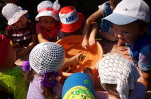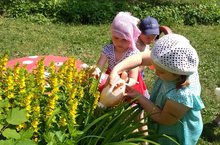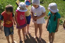 Сейчас лето, а это хорошее время для укрепления здоровья детей. Под девизом «Солнце воздух и вода – наши лучшие друзья» проходили наши прогулки со 2 по 9 июля. Ребята ходили босиком, играли с водой и всё это делали с удовольствием. Всю неделю погода была жаркой. Пить хотелось всем и нашим цветам тоже. Дети пришли им на помощь. Не жалея сил, носили воду и поливали. В руках оказалась лупа, и для детей открылся новый мир – микромир. Рассматривали всё и всех подряд: лепестки, муравьёв. Сделали открытие – оказывается, песок – это просто очень мелкие камешки!