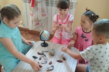 В течение всей недели дети узнавали что-то новое о разных интересных вещах. Ребята рассматривали модель Земли - глобус. Оказывается, большая часть планеты покрыта водой – океанами, морями. В морях живёт много обитателей, в том числе моллюски. Они живут в раковинах. А ещё морские волны делают гладкими камни. На прогулке была организована мини-лаборатория. Задача - узнать, какой камень высохнет быстрее – который лежит на солнце или который в тени; гладкий или шероховатый. Ещё один загадочный для нас мир – космос. Дети с удовольствием рассматривают иллюстрацию нашей Солнечной системы. Для них было удивительно узнать, что наша Земля совсем маленькая планета и она не одна крутится вокруг Солнца
