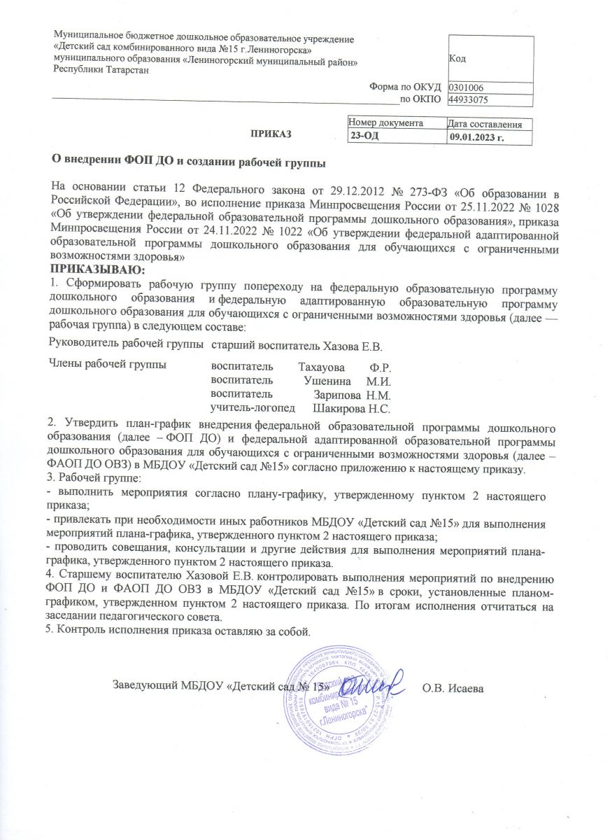 Приказ "О внедрении Федеральной образовательной программы ДОУ и создании рабочей группы"