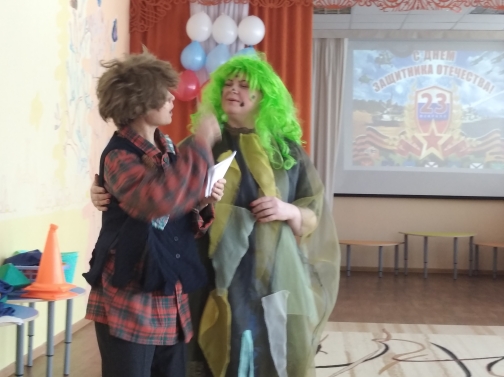 Сегодгня в старшей группе воспитатель Филимонова Елена Анатольевна и музыкальный руководитель Матвеева Лариса Викторовна организовали и провели развлечени “Как Кикимора внука в армию провожала”. На празднике дети с задором исполняли весёлые военные песни и частушки, читали стихи, проявили ловкость, быстроту и смекалку в спортивных военных играх. И конечно же не обошлось без шуточных героев. В гости к детям пришла Кикимора со своим внуком Лешим , которого наши воспитанники обучали всем тонкостям армейской жизни.