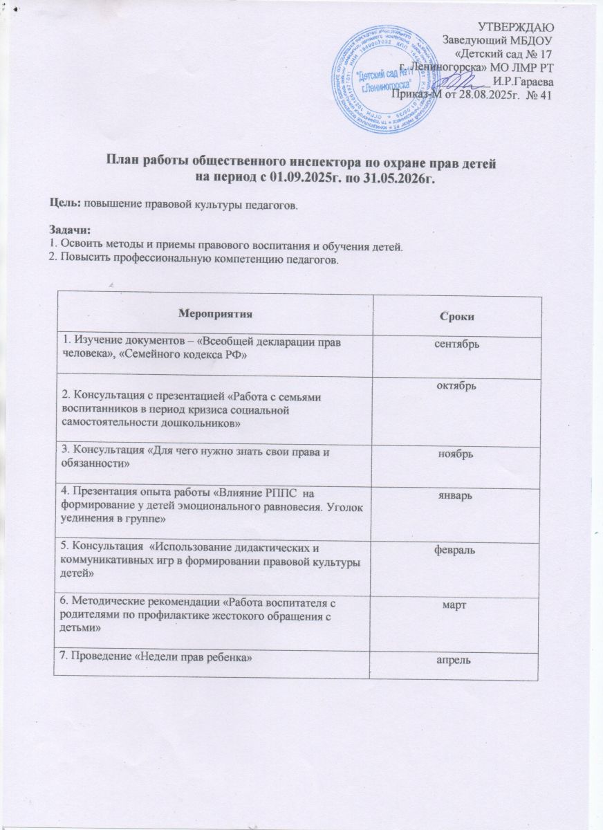 План работы общественного инспектора на период с 01.09.2025г. по 31.05.2026г.
