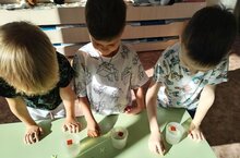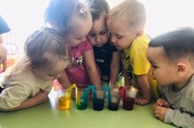Детское экспериментирование имеет огромный развивающий потенциал. Оно даёт детям реальные представления о различных сторонах изучаемого объекта. В процессе эксперимента идёт обогащение памяти ребенка, активизируются его мыслительные процессы. Сегодня воспитанники 1 младшей группы были начинающими учёными и, вооружившись "волшебными лупами", исследовали свойства цвета. В процессе экспериментальной деятельности, ребята закрепили знания красного и синего цвета, учились работать в команде. // Балалар эксперименты зур үсеш алган потенциалга ия. Ул балаларга өйрәнелә торган объектның төрле яклары турында реаль күзаллаулар бирә. Эксперимент процессында бала хәтерен баету бара, аның акыл процесслары активлаша. Бүген 1 кече төркемдә тәрбияләнүчеләр башлангыч галимнәр булган һәм "тылсымлы луплар" белән коралланып, төснең үзлекләрен тикшергәннәр. Эксперимент эшчәнлеге процессында балалар кызыл һәм зәңгәр төстәге белемнәрен ныгыттылар, командада эшләргә өйрәнделәр.