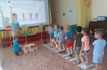В целях закрепления знаний воспитанников о безопасном поведении на дорогах, назначении дорожных знаков, развития умения правильно находить выход в дорожных ситуациях воспитанники старшей группы приняли участие в интеллектуальной игре Брейн-ринг по правилам безопасного поведения на дорогах «Добрая дорога детства». На столах участников были разложены конверты с заданиями. Очерёдность заданий определялась волчком со стрелкой. Каждое правильно выполненное задание оценивалось фишкой. Игра началась с задания «Угадай знак», по итогам обе команды набрали равное количество фишек-5 штук. В задании «Почемучки» (работа на макете) команда «Светофорики» набрала на 1 фишку больше команды «Грамотный пешеход» и вырвалась вперед, но в Блиц- опросе количество фишек сравнялось. Подвижная игра «Кто внимательнее» (на знание сигналов регулировщика) сплотила всех ребят и в конкурсе «Черный ящик» дошкольники легко отгадали его содержимое (бустер). В конце игры подсчитали фишки, оказалось, что обе команды набрали равное их количество, стали победителями и были награждены грамотами.