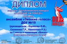 Поздравляем вокальный ансамбль "Звонкие голоса" и музыкального руководителя Каримову Л.Ю. с победой в Республиканском конкурсе "Равнение на победу". Молодцы!