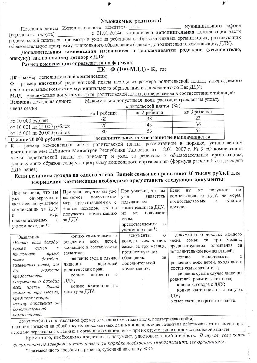 Порядок предоставления компенсации родителям детей посещающих детский сад.