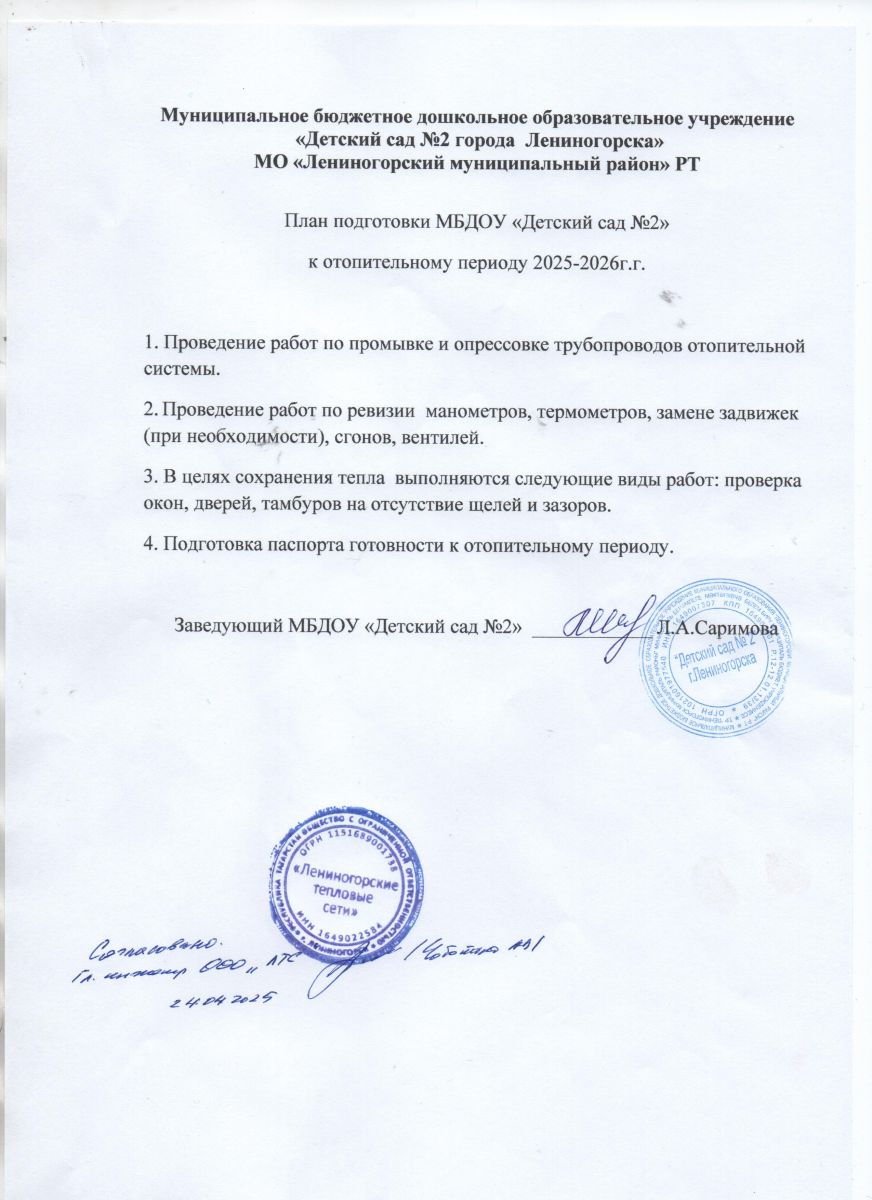 План подготовки МБДОУ «Детский сад №2» к отопительному периоду 2025-2026г.г.