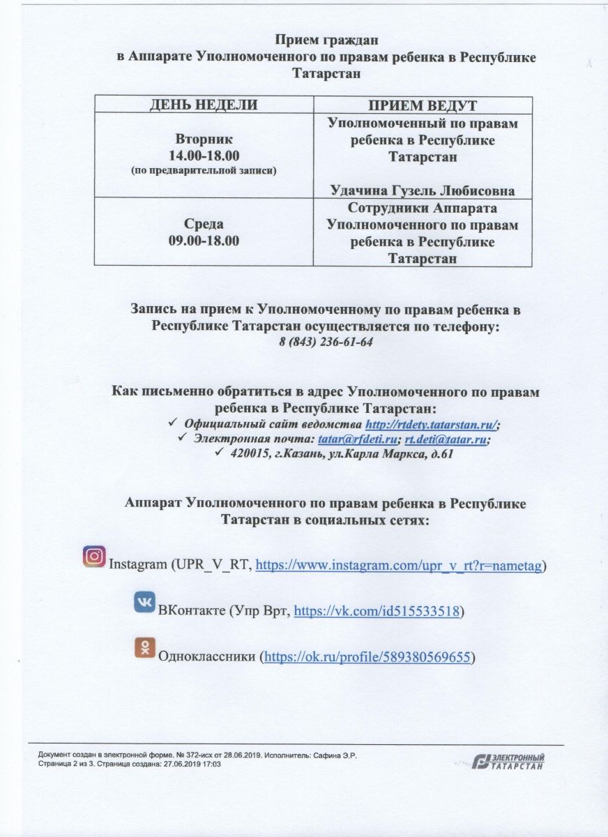 Опубликовано: 05.07.2019Прием граждан в Аппарате Уполномоченного по правам ребенка в Республике Татарстан