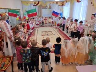 Сегодня, в преддверии Международного дня родного языка, наш детский сад превратился в яркую палитру национальных узоров, красок и звуков. Праздник под названием «Под небом единым на разных языках» объединил воспитанников групп, став ярким событием Года народного единства в нашем саду. Начался праздник веселым хороводом всех участников мероприятия, символизирующим единение и дружбу народов. В течение мероприятия весело и задорно принимали гостей праздника - представителей разных национальностей: русской, татарской, чувашской, мордовской. Ребята веселились от души! Играли в игры народов Поволжья, демонстрировали национальные одежды каждого народа, показывали друг другу народные танцы, песни, игры. А закончился праздник наставлением: