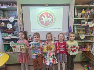 Так, в преддверии данного мероприятия, в средней группе воспитателем по обучению татарскому языку Зиганшиной Р.Я. и воспитателем Газимзяновой Р.Ф., было проведено познавательно - тематическое занятие: «День Государственного герба РТ». На данном занятии педагоги познакомили детей с историей происхождения герба РТ. Беседа о гербе Татарстана очень заинтересовала ребят: поговорили о значении символов нашего герба, флага, вспомнили, что главная песня Татарстана – это гимн. Играли в игры: «Собери герб РТ», «Найди среди гербов разных стран- герб Татарстана», «Мой Татарстан», «Символика РТ»