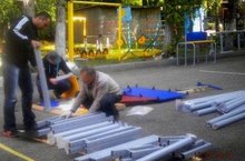 На территории детского сада проводятся работы по сборке игрового и спортивного оборудования, приобретенного на денежные средства, выигранные за участие в республиканском конкурсе "Народный социальный проект" с привлечением родителей воспитанников.