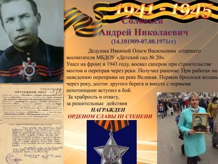 9 Мая – особая и священная дата в истории России для каждого из нас кто помнит и чтит память о дедах и прадедах, совершавших свой подвиг на передовой, сражаясь в боях за освобождение нашей Родины. О тех, кто совершал свой подвиг в тылу - на заводах по производству техники и боеприпасов, на предприятиях, обеспечивающих боеспособность нашей армии. Для каждого из нас кто помнит и чтит память о погибших в годы Великой Отечественной войны, в честь 75 –летия Победы в Великой Отечественной войне, с целью формирования у детей интереса к истории своей семьи, к судьбам родных, принимавших участие в Великой Отечественной войне. В нашем детском саду создаётся Книга памяти, в которую вносятся сведения об участниках ВОВ, блокадниках, тружениках тыла, ветеранах. В составлении Книги памяти принимают участие родители воспитанников и сотрудники детского сада. К 9 мая постараемся внести в нашу Книгу памяти всех прадедушек наших воспитанников. Спасибо родителям, принявшим участие в данной акции.