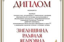 Поздравляем воспитателя по обучению детей татарскому языку Зиганшину Р.Я.. Она стала лауреатом республиканского конкурса пьес, инсценировок и тематических сценариев мероприятий дошкольных и общеобразовательных учреждений Республики Татарстан "Мәктәп сәхнәсе", организатором которого является Министерство образования и науки РТ и редакция журналов «Сәхнә» и «Салават күпере».
