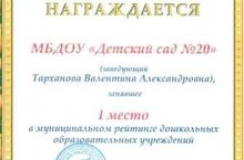 25 августа 2017г. на августовской конференции педагогических работников Лениногорского муниципального района МБДОУ "Детский сад № 20" награжден грамотой МКУ "Управления образования" ИКМО "ЛМР" РТ за 1 место в муниципальном рейтинге дошкольных образовательных учреждений!