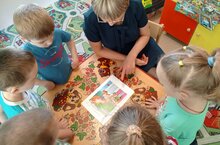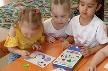 На занятии по рисованию воспитанники старшей группы познакомились с историей дымковской игрушки. Ребята рассмотрели глиняные игрушки, послушали историю их создания, узнали о характерных особенностях росписи игрушек, учились создавать узоры по собственному замыслу. Воспитанники с помощью взрослого выделили элементы геометрического узора дымковской росписи (круги, прямые и волнистые линии, клетка, точки-горошины).