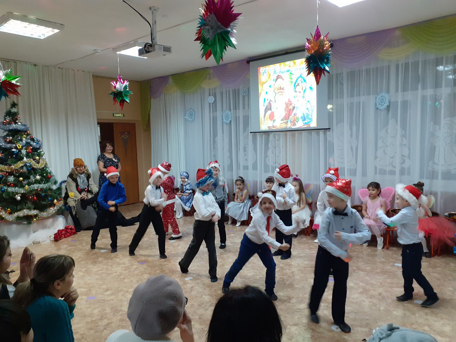 Для детей младших групп прошли новогодние представления. Так, в гости к самым маленьким воспитанникам пришли Снегурочка, Дед Мороз и Лисонька. Малыши спели песенки, почитали стишки, поплясали, поиграли в игры «Зайчики и Лисичка», «Собери снежки». А ребятки второй младшей группы оказались в сказке «Заюшкина избушка», где они встретились с Зайчиком и хитрой Лисичкой. И вместе с Дедом Морозом и Снегурочкой ребята помогли Зайчику отвоевать свою избушку, а Лисичку простили. И все вместе заводили хоровод у ёлочки, танцевали, играли в игры, порадовали Деда Мороза стихами. Праздники удались на славу! Малыши повеселились от души!