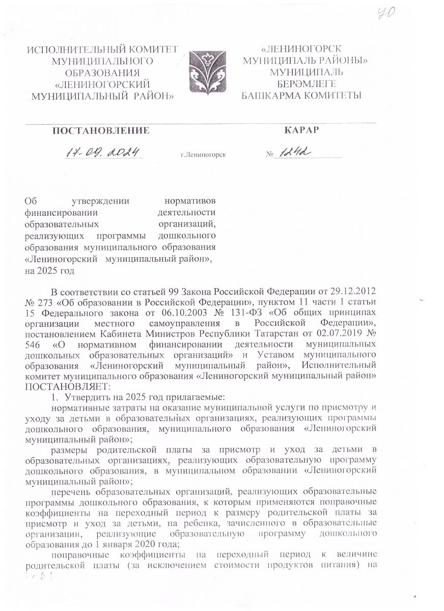 Постановление № 1242 от 17.09.2024 г. «Об утверждении нормативов финансировании деятельности образовательных организаций, реализующих программы дошкольного образования муниципального образования «Лениногорский муниципальный район» на 2025 год»