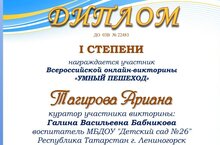 Воспитанница старшей группы Тагирова Ариана под руководством воспитателя Бабниковой Г.В. стала победителем Всероссийской онлайн -викторины "Умный пешеход" организованного центром роста талантливых детей и педагогов "Эйнштейн". Желаем Ариане дальнейших побед.
