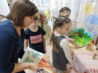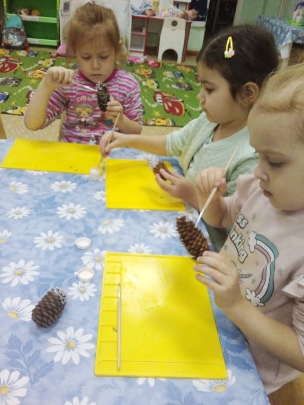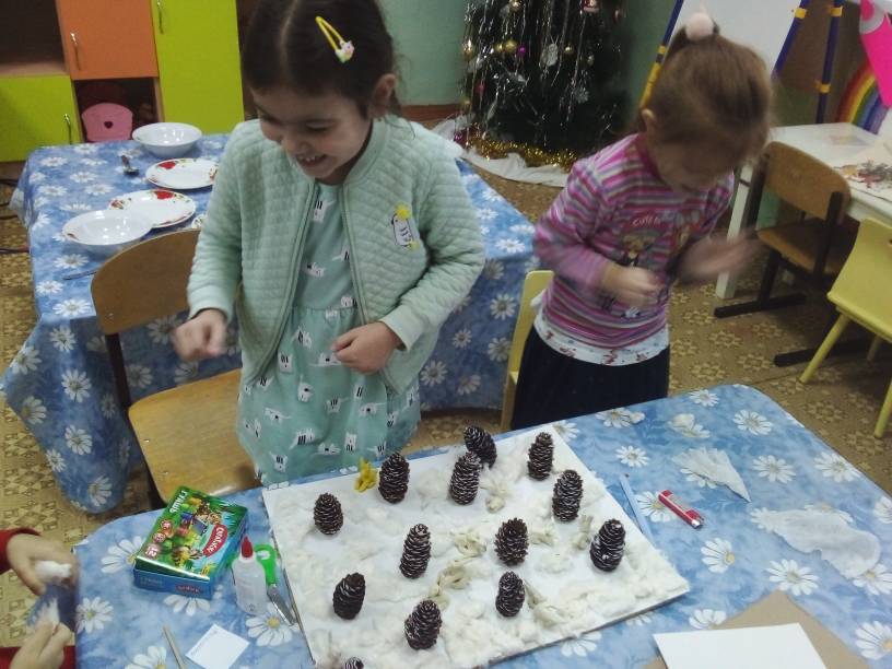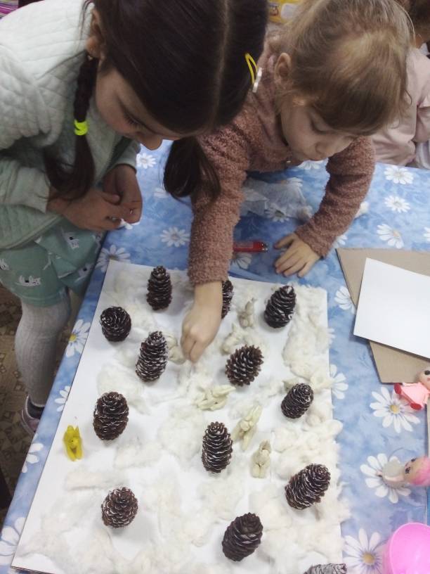 В старшей группе детского сада под руководством воспитателя Бабниковой Г.В. дети создали композицию из шишек, пластилина и ваты. Дети с удовольствием раскрашивали шишки, лепили зайцев, а так же готовили основу для композиции. Коллективные работы хороши тем, что дети учатся работать вместе, помогая друг другу, иногда споря, доказывая, т. е. учатся взаимодействовать, договариваться. Дети всегда находят на коллективной работе свои детали, гордятся своей работой, результат всегда замечательный. Это позволяет детям почувствовать себя уверенно, повысить свою самооценку.