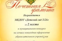 С 03 по 21 декабря 2018 года проходил конкурс «Лучшее новогоднее оформление» цель конкурса – выявление лучшего образного, цветового и светового решения новогоднего оформления фасадов зданий, прилегающих территорий образовательных учреждений Лениногорского муниципального района РТ. Детский сад в конкурсе «Лучшее новогоднее оформление» занял 2 место и был награжден грамотой Управления образования Лениногорского муниципального района РТ.