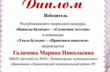«Кояшлы балачак» – «Солнечное детство». Учредитель и организатор Конкурса Редакция журнала «Тылсымлы куллар», ООО «Ихлас».Цели и задачи конкурса: приобщение подрастающего поколения к ценностям татарской культуры, выявление творческих возможностей детей и подростков по сохранению и развитию народных традиций, воспитание толерантности и патриотизма у подрастающего поколения, обмен идеями и опытом педагогов для повышения профессионального, творческого уровня и мастерства, а также популяризации инновационного педагогического опыта. В конкурсе приняли участие 8 педагогов в разных номинациях. Поздравляем наших воспитателей с достигнутыми результатами.