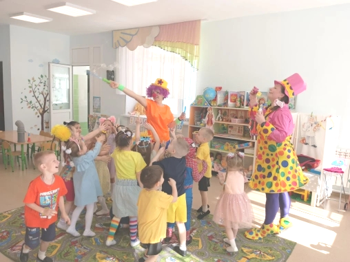 Первое апреля в нашем саду выдалось солнечным и тёплым - самое время для шуток и веселья! В этот день по группам детского сада отправились два весёлых гостя - озорной клоун Прошка и задорная Веселинка. Они решили устроить праздник для всех ребят: от самых маленьких до старших дошколят.