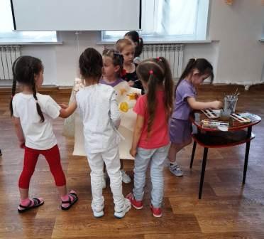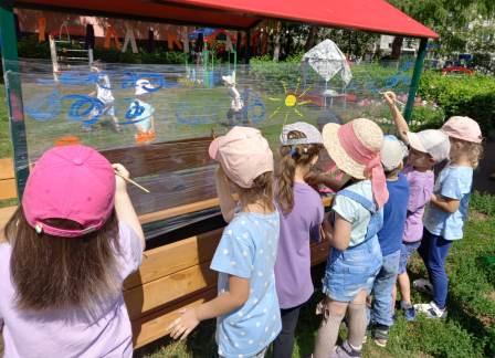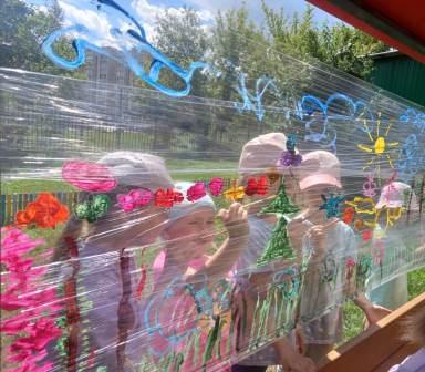 На прогулке, опираясь на карточки с изображением деревьев, искали похожие деревья. С удовольствием рисовали гуашью бабочек, цветы, деревья, облака, солнышко на натянутой пищевой плёнке. Все были увлечены творчеством. А какая замечательная совместная картина получилась!