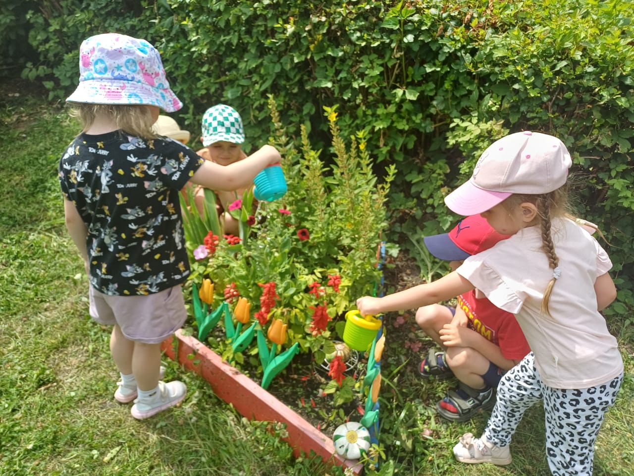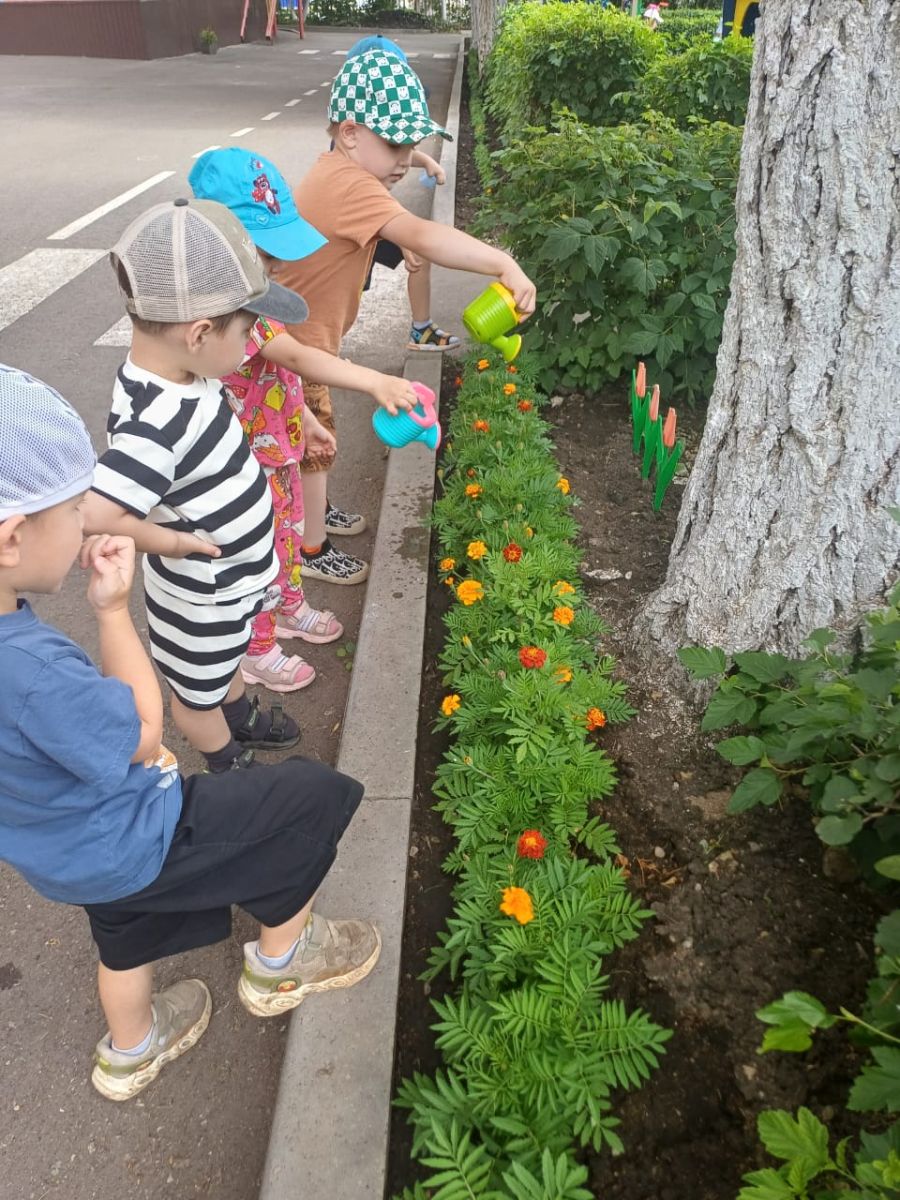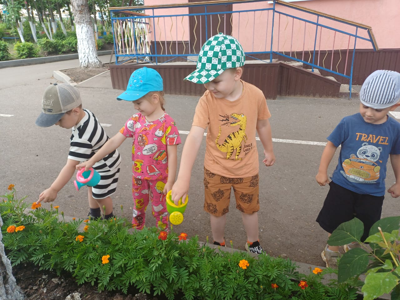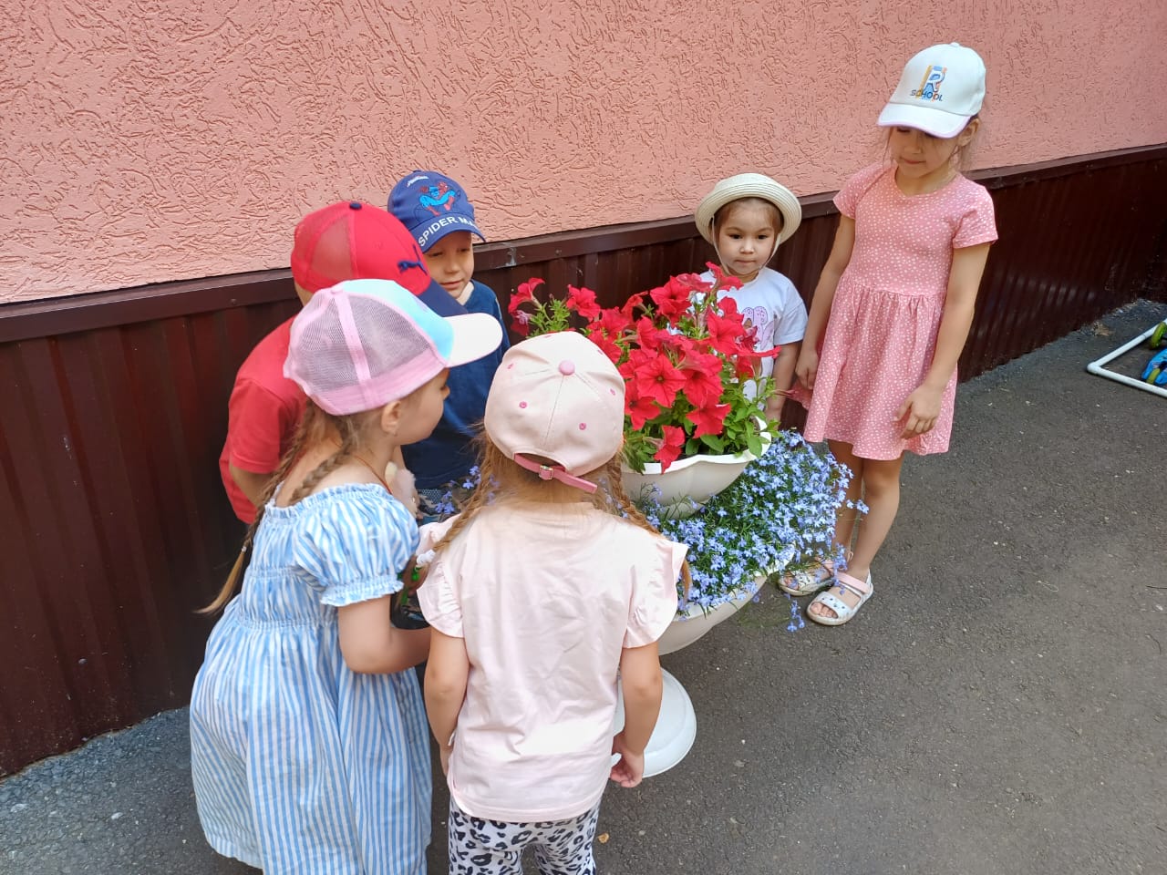 Безнең балалар бакчасы территориясендә чәчәкләр, агачлар, куаклар үсә, алар балаларга үсемлекләрнең гаҗәеп матур дөньясын аңларга, яратырга, шулай ук хезмәт күнекмәләрен үзләштерергә ярдәм итә. Ачык һавада, күзәтүләр вакытында балалар белән чәчәкләрне карау кагыйдәләре турында әңгәмә үткәрелде, үсемлекләр белән сак эш итү кагыйдәләре белән таныштылар, чәчәкләрнең исемнәрен ныгыттылар. Тәрбияче балаларга үсемлекләрне карарга тәкъдим итте. Балалар чәчәкләргә рәхәтләнеп су сиптеләр. Балалар бакчасы территориясендәге чәчәк түтәлләре чәчәкләрне карау һәм күзәтү мөмкинлеге генә түгел, ә балаларга, әти-әниләргә һәм хезмәткәрләргә яхшы кәеф тудыра.