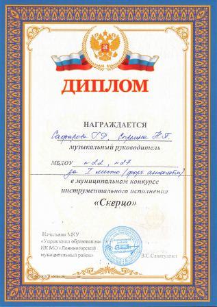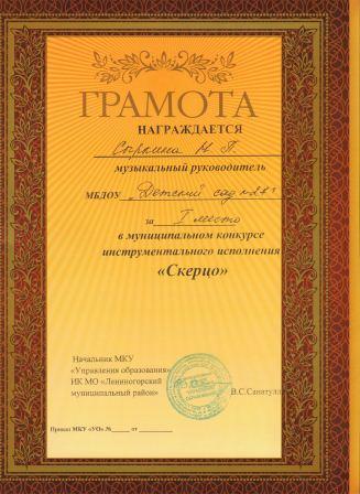 Поздравляем Сыркину Наталью Петровну, музыкального руководителя, с победой в муниципальном конкурсе инструментального исполнения "Скерцо". Желаем дальнейших творческих побед!