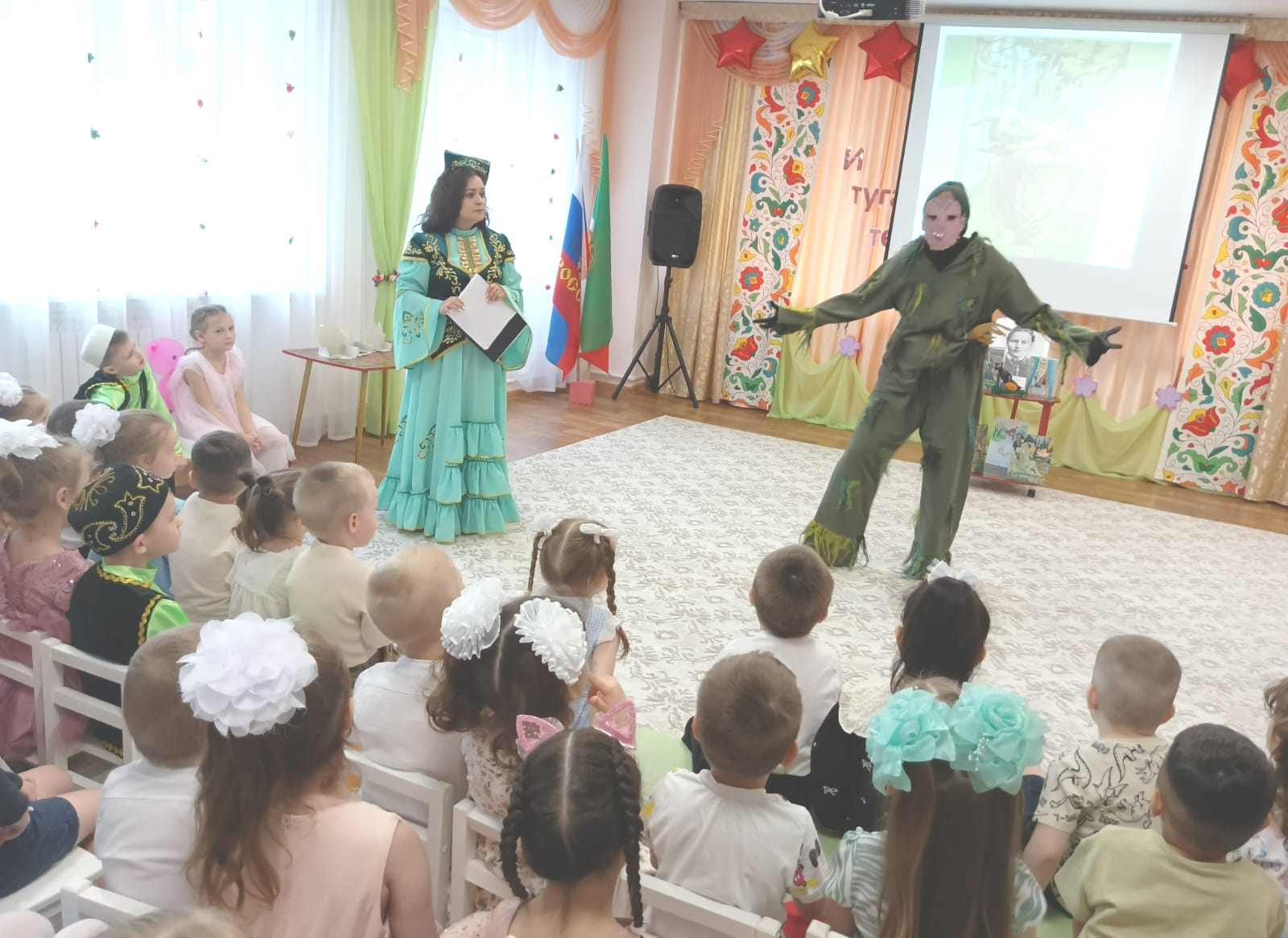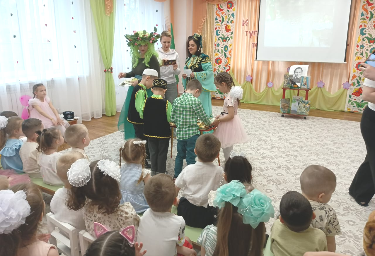 В наш детский сад пришли гости, сотрудники городской детской библиотеки им. Ю. Гагарина. Они рассказали биографию поэта, показали костюмированное представление с героями сказок Тукая, организовали веселые игры. Наши воспитанники приготовили стихи и стали участниками выставки "Сказочный мир Габдуллы Тукая".