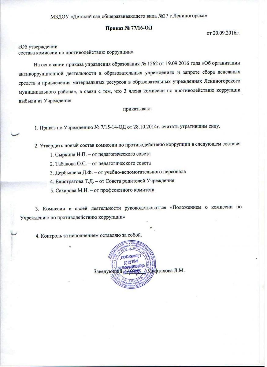Приказ № 77/16-ОД "Об утверждении состава Комиссии по противодействию коррупции"