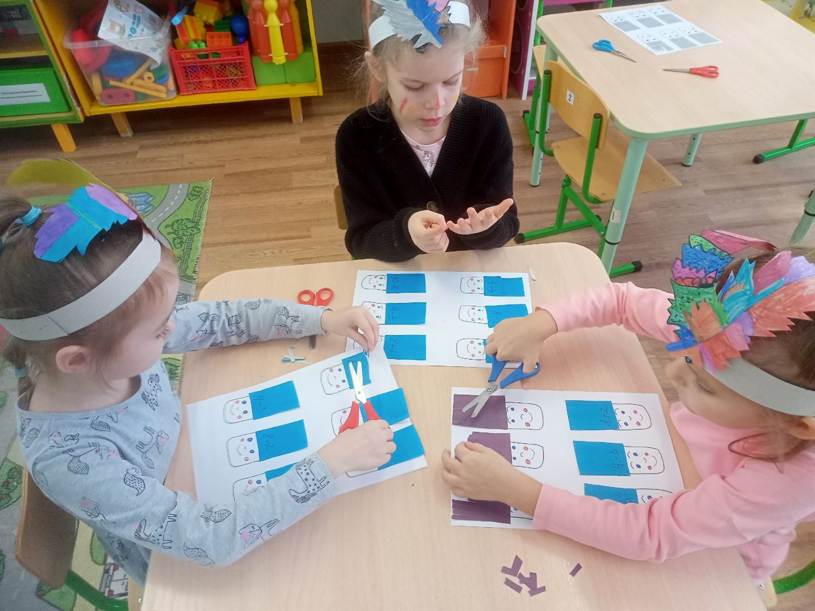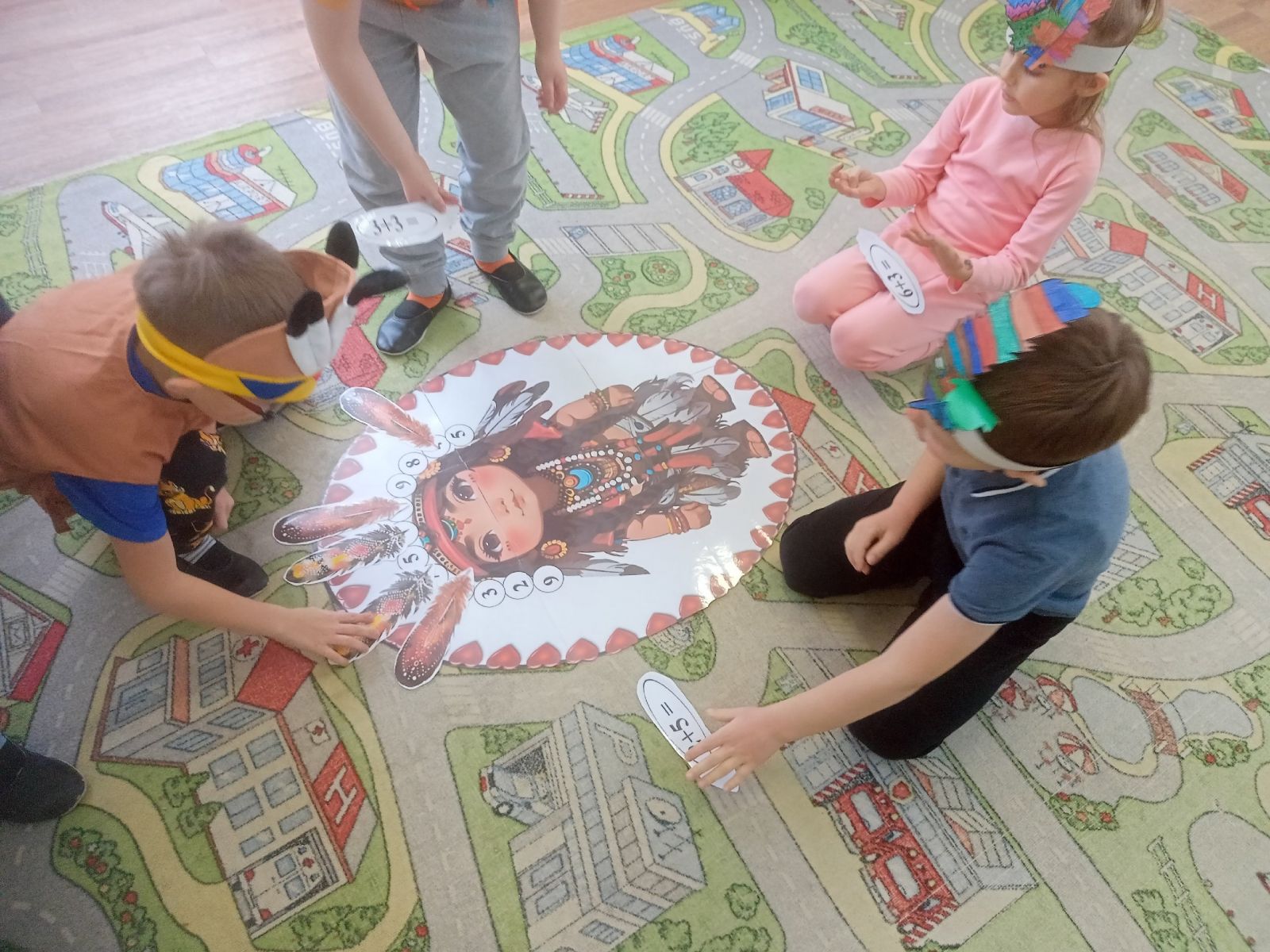 Сегодня в подготовительной группе прошла квест игра (по ФЭМП) "По следам индейских племен" . Ребята украшали головной убор перьями с помощью решения задач на сложение и вычитание, ориентировались на листе бумаги, измеряли отрезки(игра "Что выше,что шире").