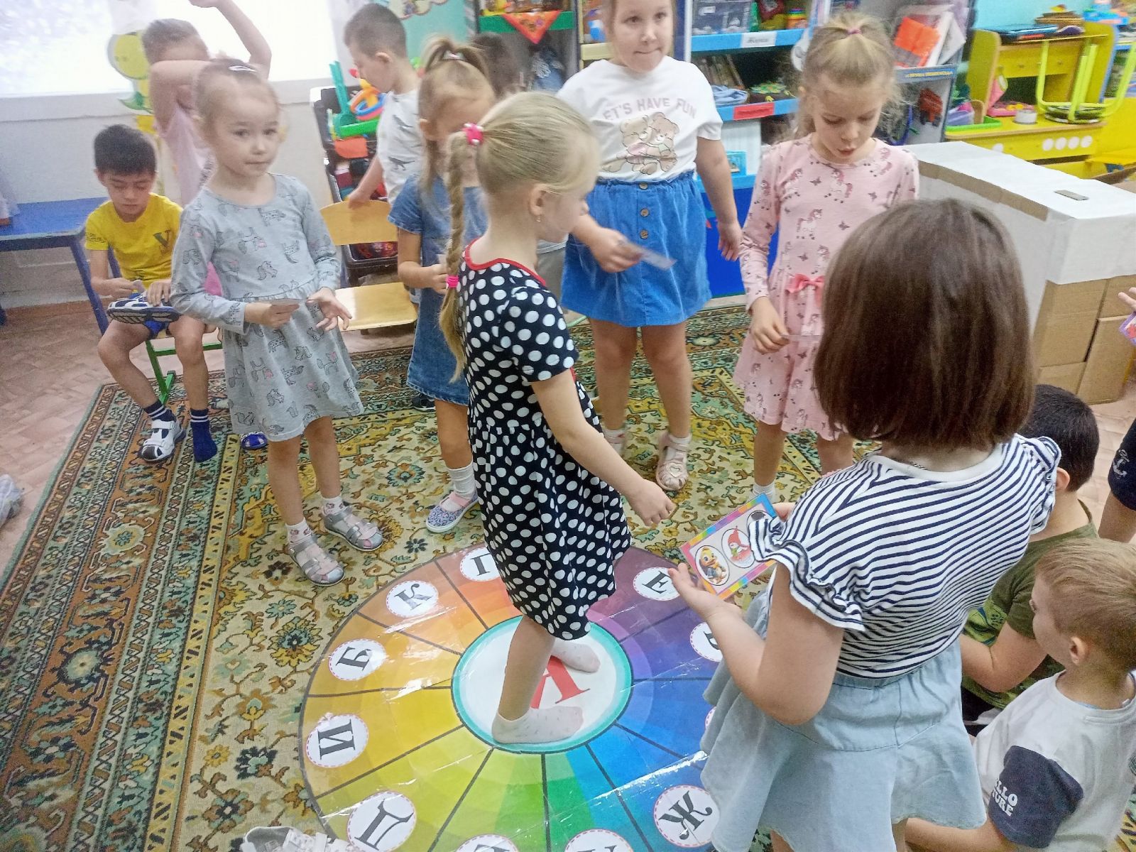 Сегодня с ребятами играли в напольную игру "Разноцветное колесо". Это разноцветное речевое колесо можно использовать как часть занятия, а так же и для самостоятельной игры. Закрепляли знания гласных и согластных.