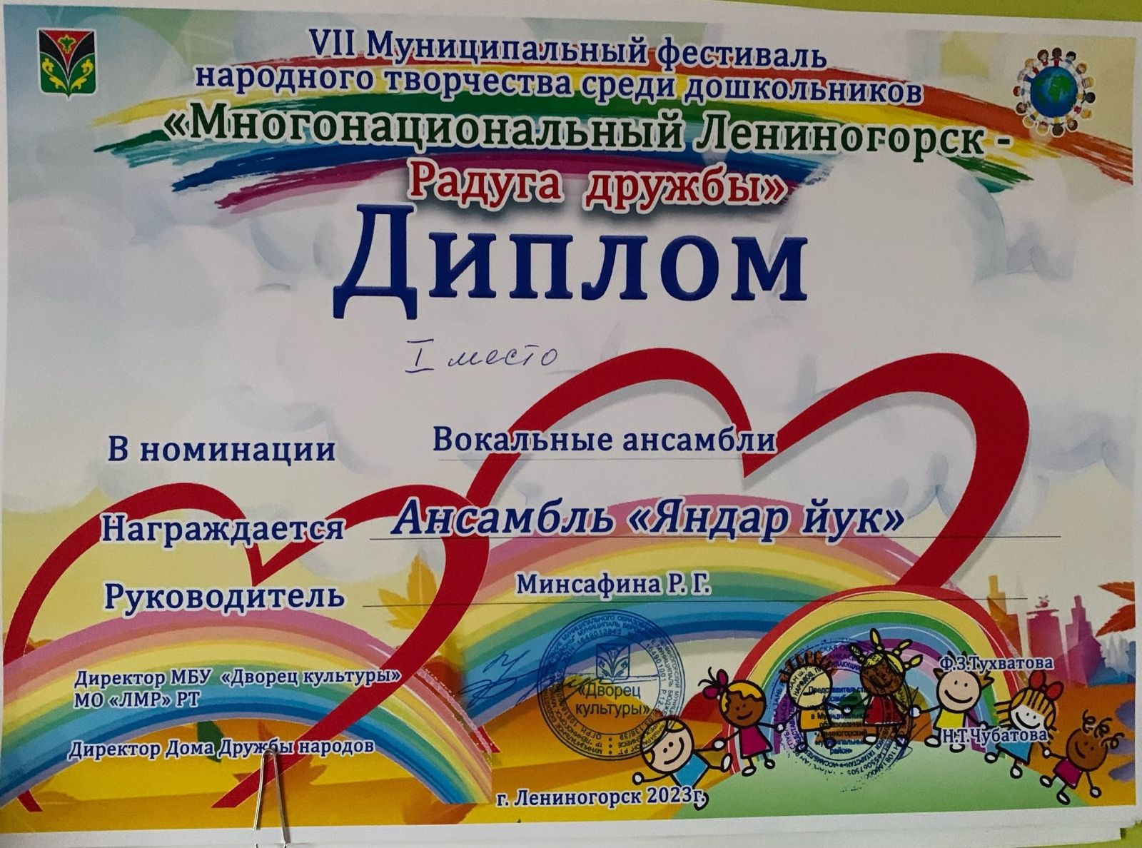 24 октября в ДК проходил Муниципальный фестиваль народного творчества среди дошкольников «Многонациональный Лениногорск-Радуга дружбы». Воспитанники подготовительной к школе группы, под руководством музыкального руководителя, приняли участие в этом зрелищном мероприятие . В номинации «Вокальные ансамбли» наши ребята стали лучшими . И завоевали 1 место ! Поздравляем наших детей с заслуженной победой в конкурсе!