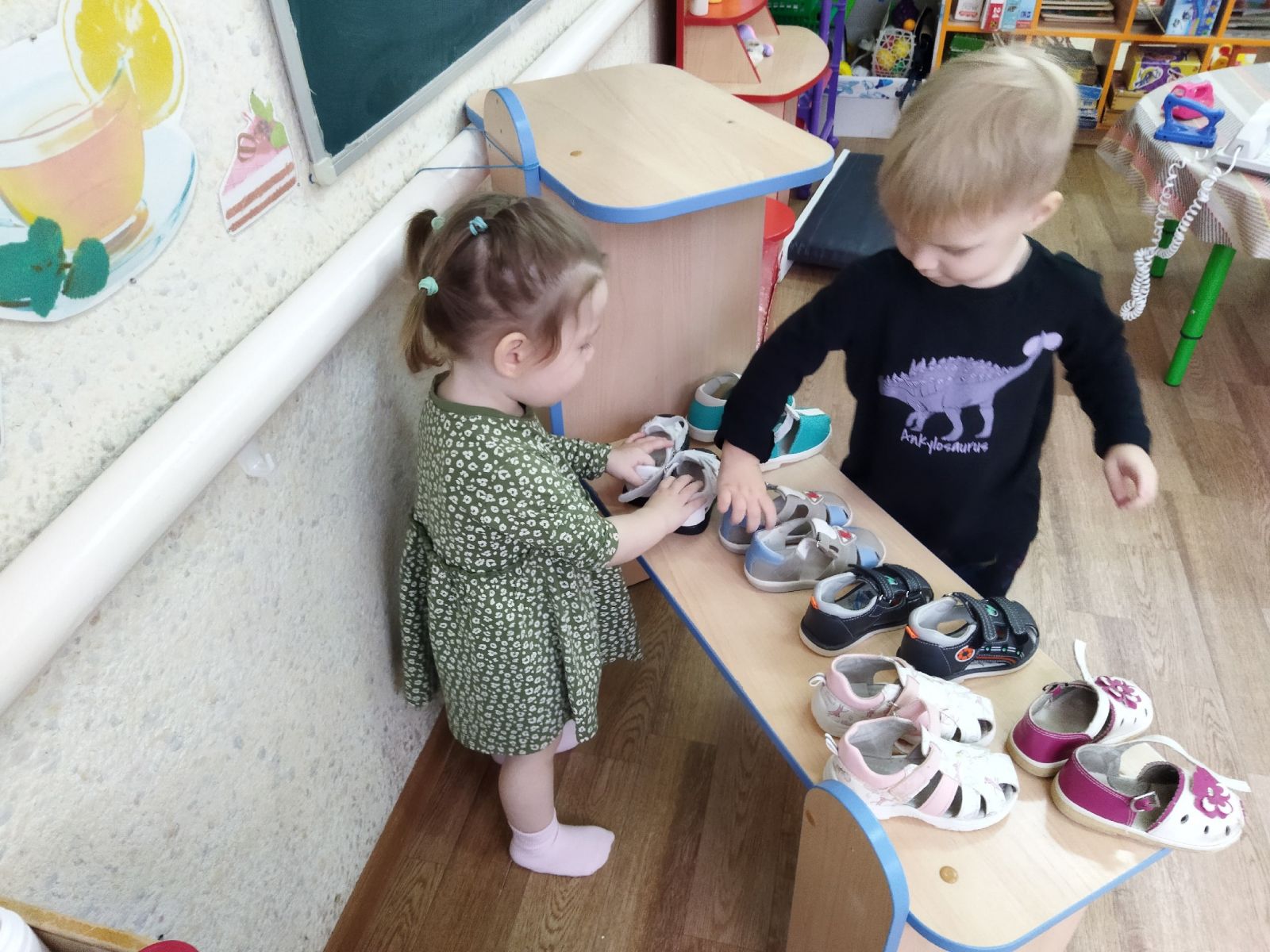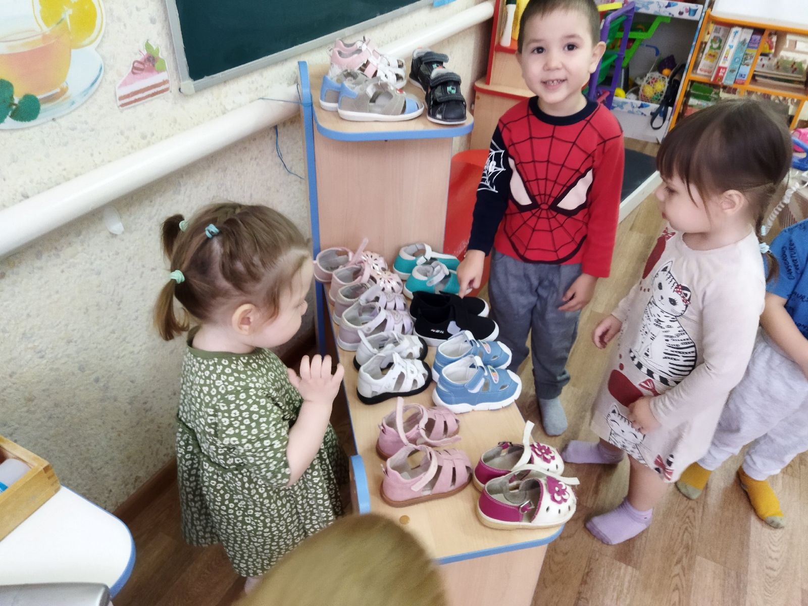Тематическая неделя "Одежда и обувь" Дети младшей группы играют в сюжетно ролевую игру "Магазин обуви" - для формирования представлений о видах обуви.